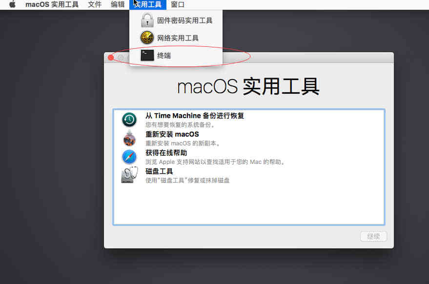 Command + R键,按住不动,稍待片刻,电脑会进入到恢复模式。 - 进入后打开顶部 实用工具--终端。
