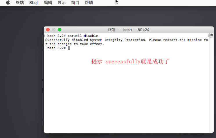 csrutil disable关闭SIP。 (同样的步骤输入命令csrutil enable,即可重新打开SIP)