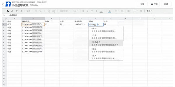 ID函数可以实现一个函数提取身份证号码中隐藏的信息,例如年龄、性别、出生年月、星座、生肖,不再需要嵌套大量的函数进行信息提取。同时,ID函数会自动对身份证号码的有效性进行验证,错误的身份证号码会提示错误。