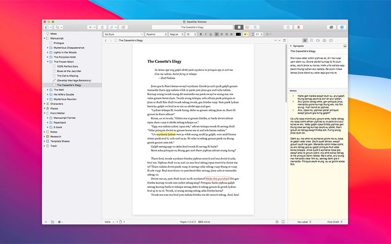 - 文本编辑,如果您曾经使用过文字处理器,那么您会在 Scrivener 的编辑器中感到宾至如归。添加粗体、斜体和您期望的所有其他格式。突出需要工作的短语。添加评论和注释。制作列表,或插入图像和表格。通过切换到页面视图,您可以看到页面在您键入时填满。