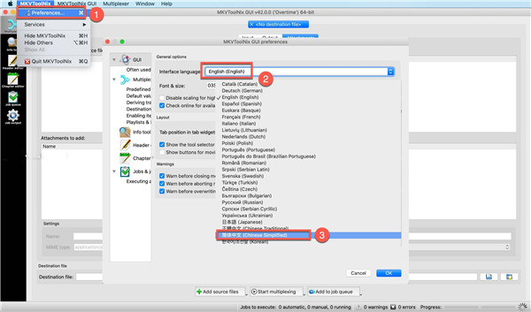 如下图所示:运行MKVToolNix,点击菜单栏MKVToolNix→Preferences,language选择简体中文即可。