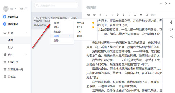 5、笔记记录完成之后,可以选中笔记列表右击鼠标打开菜单,在菜单中您可以移动笔记,置顶笔记和将笔记保存成其它文档。