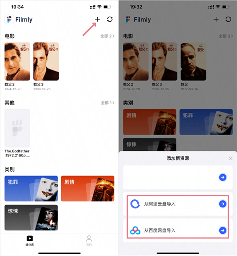 1、在移动端App右上角,点击+,并选择需要添加的网盘(从阿里云盘导入、从百度网盘导入)