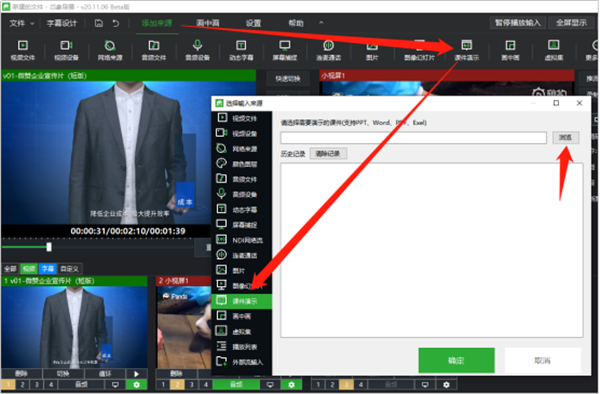 1、点击【添加来源-课件演示】可以添加课件进行课件演示(也可以通过点击【+添加视频】选择课件演示);