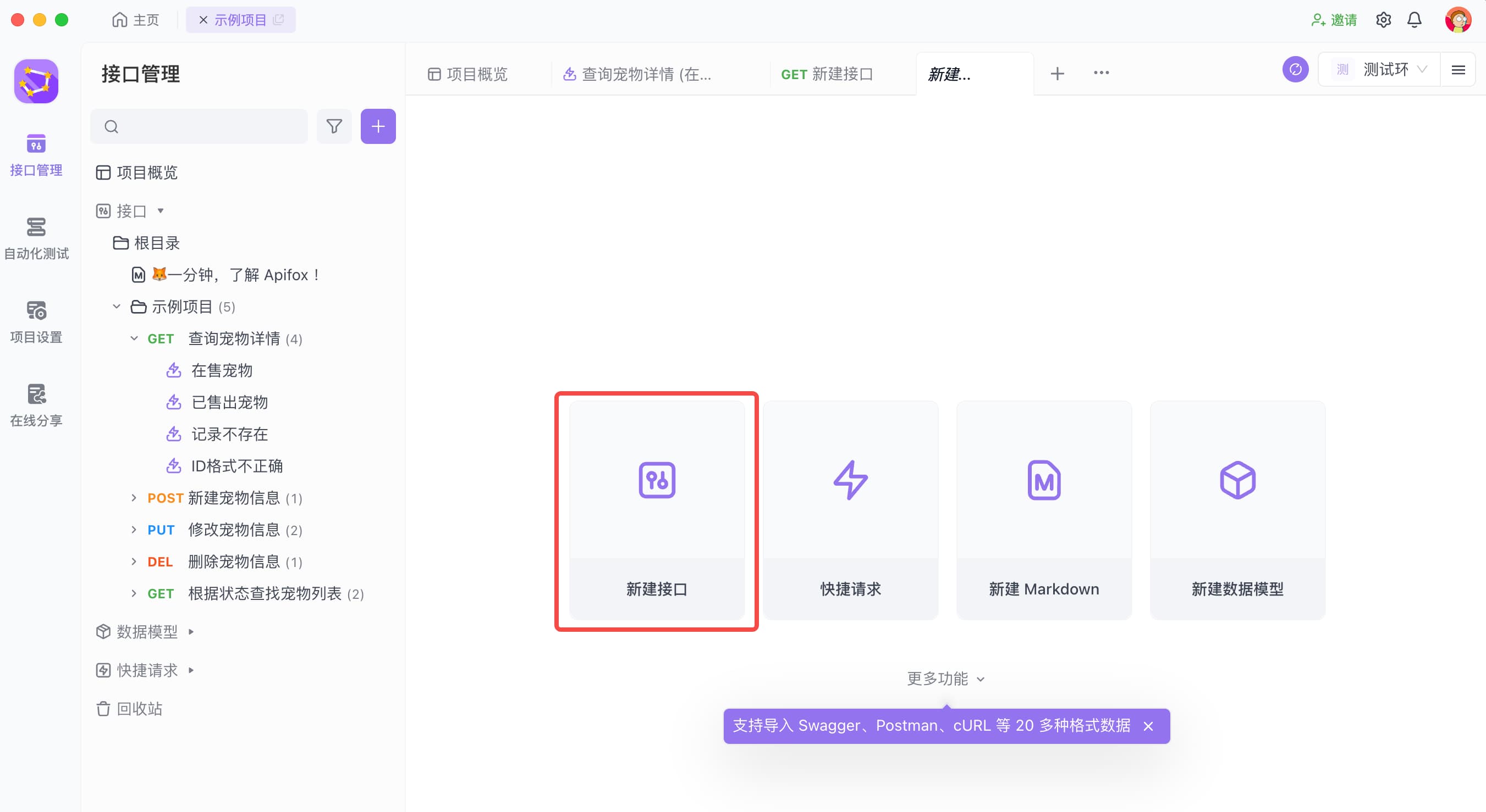 进入 Apifox 项目后,你可以通过手动新建或导入外部接口的方式创建 HTTP 类型接口。