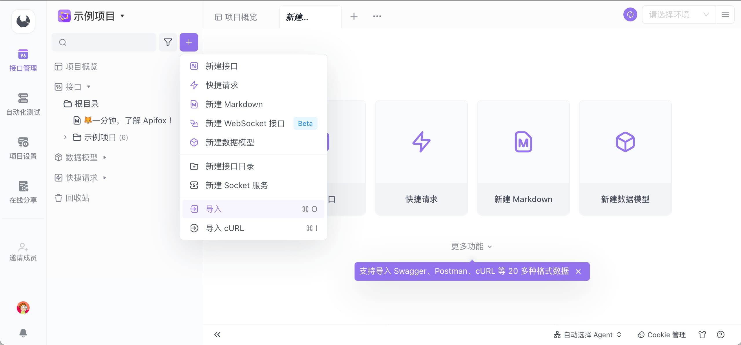 支持导入 OpenAPI (Swagger)、Postman、HAR、RAP2、JMeter、YApi、Eolinker、RAML、DOClever 、Apizza 、DOCWAY、ShowDoc、I/O Docs、WADL、Google Discovery 等数据格式。