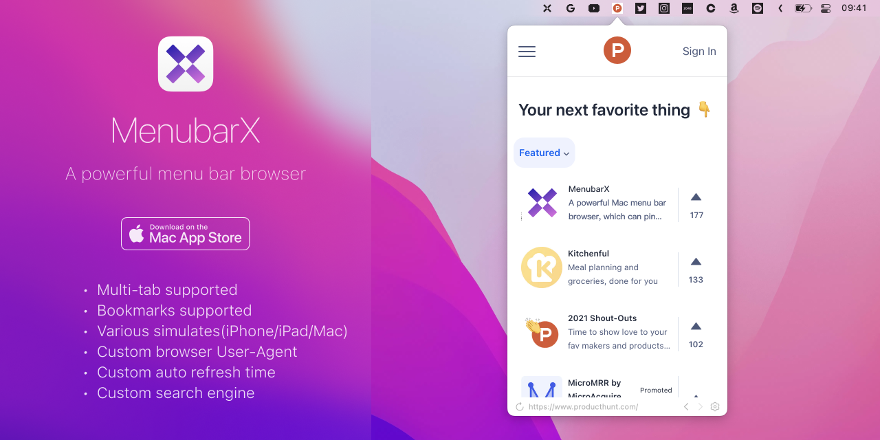MenubarX Mac版是一款功能强大的菜单栏浏览器,完美支持各类网页、Web 应用以及渐进式Web应用,在地址栏输入网址即可快速访问目标页面,平时可收起仅显示图标,轻巧灵活、随点随用。