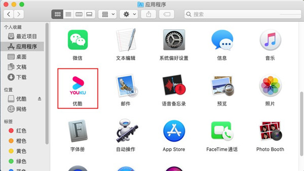 3、之后我们便可以在MacOS自带的文件管理器的“应用程序”栏目中找到我们的优酷客户端Mac版,找到它之后我们就可以双击打开将它运行了