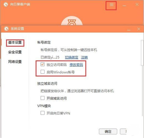 2、然后打开windows系统的向日葵客户端设置,在这里找到独立秘密,设置一个你想要的密码。