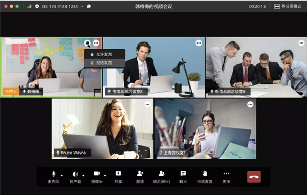 会议中可切换屏幕显示,点击界面右上角可切换画中画模式、等分模式、演讲者模式。
