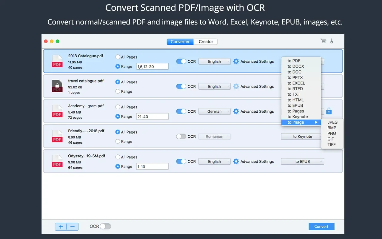 准确的将PDF转换为Word,Excel,Keynote:无论本机PDF或扫描PDF,Cisdem PDF转换器OCR都可以批量转换为.docx,.xlsx,.pptx和其他所需的格式。