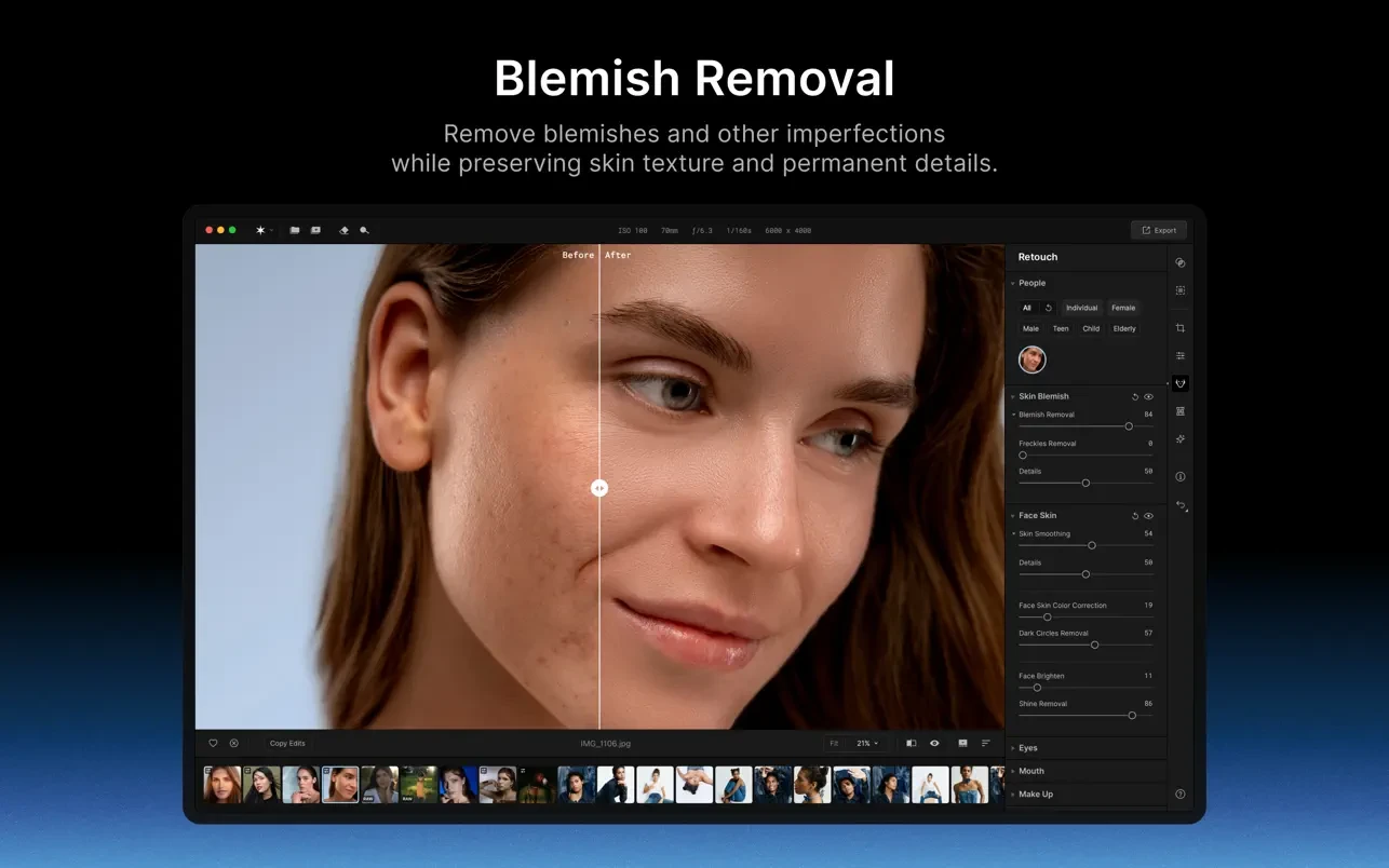 - 使皮肤光滑。均匀肤色,同时保留自然色调和毛孔等细节。