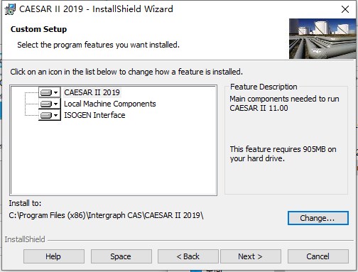 6、caesar II 安装路径选择,默认路径为C:\Program Files\Intergraph CAS\CAESAR II \,可点击Change更改,或直接默认