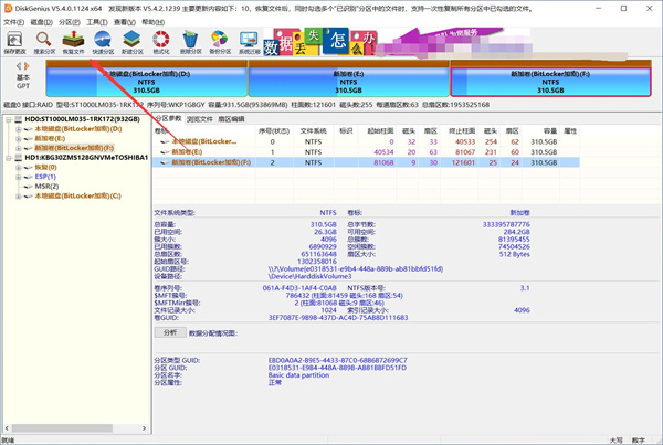 打开Diskgenius软件,选择需要恢复的磁盘,点击“恢复文件”。