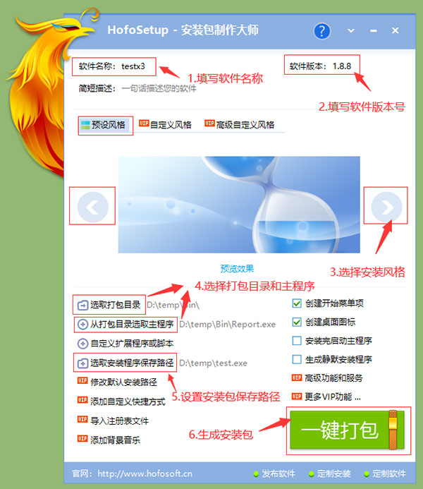 提供了简单易用的界面,只需填写简单的软件信息和进行简单的设置,就可以一键打包成精美的安装程序。