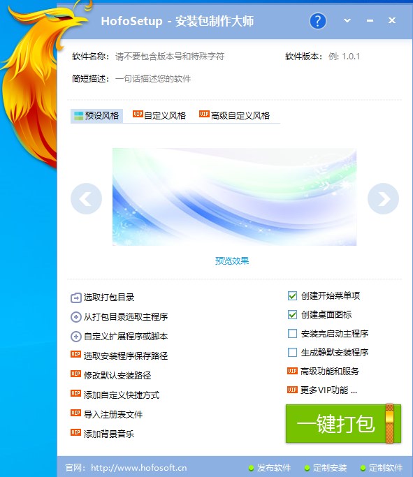 提供了强大的自定义功能,支持背景图片替换、界面大小自定义、程序图标替换等,可以轻松创建具有专业外观的软件包。