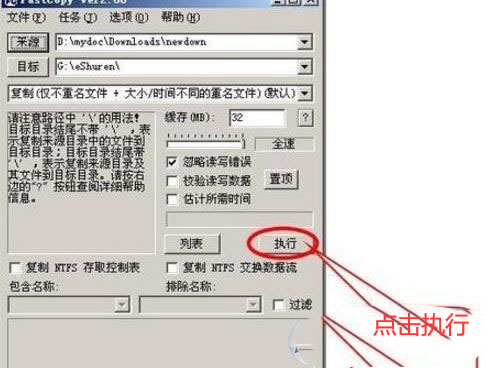 5、选择好文件来源与目标后,我们就可以单击[执行]按钮来进行复制操作,如图:
