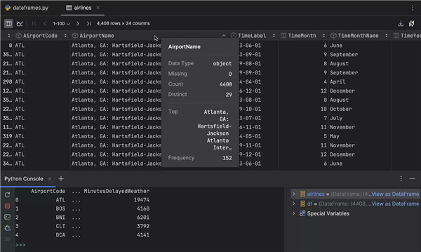 通过适用于 DataFrame 的新 UI,只需将鼠标悬停在列上,列统计信息就会自动弹出。