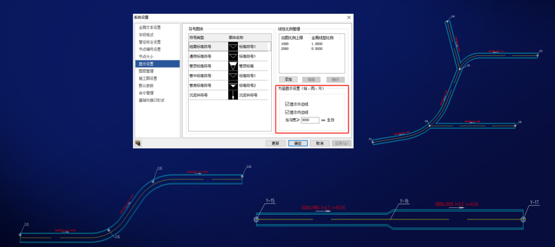 软件新增大尺寸方涵设计功能,可以根据设定的沟宽临界值控制是否按照真实尺寸显示,能自动完成方涵倒弧、交叉、渠化处理,井盖位置可以在方涵两侧贴壁处理。