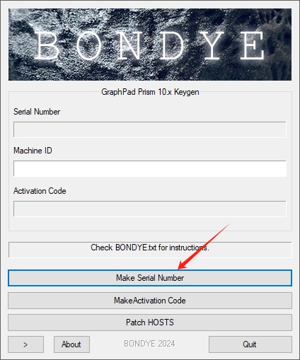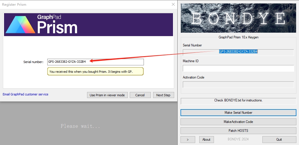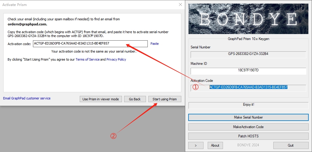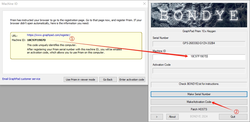 8、接着将软件中生成的【Machine ID】数字串复制粘贴至【BDY-Prism10-Win64-KG.exe】对应位置,并点击【MakeActivation Code】生成激活密钥。