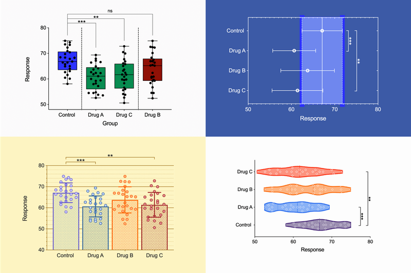 更直观地展示您的数据,而不是操作软件。 GraphPad Prism让创建所需的图形变得容易。 选择图形类型,然后自定义任何部分 - 数据的排列方式、数据点的样式、标签、字体、颜色等等。 自定义选项不尽其数。