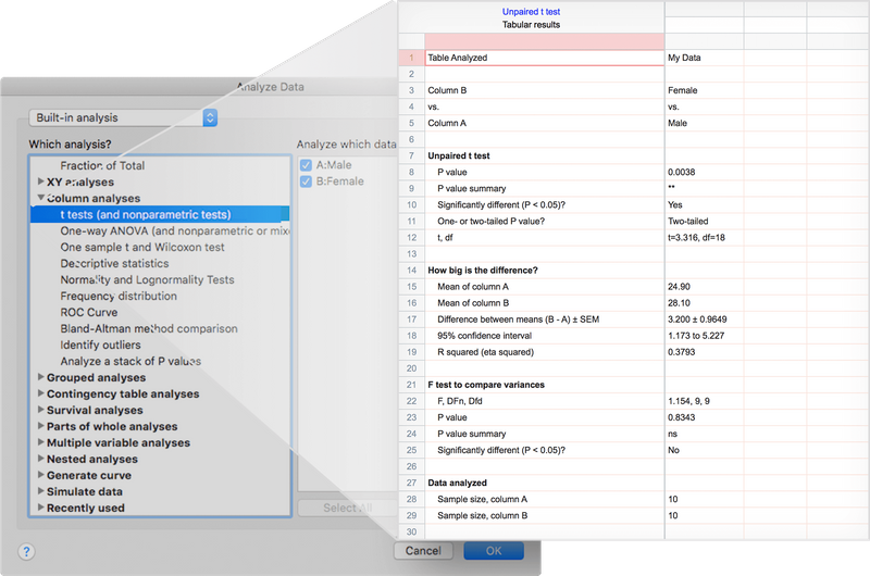 避免使用统计术语。GraphPad Prism使用清晰的语言提供大量的分析库,涵盖从普通到高度特定的分析 — 包括非线性回归、t检验、非参数比较、方差分析(单因素、双因素和三因素)、列联表分析、生存分析等等。每项分析都列有一个清单,以帮助您了解所需的统计假设并确认您选择了适当的检验。
