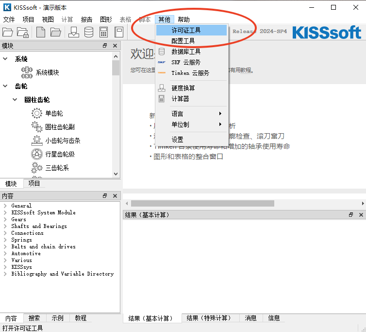 18、启动KISSsoft 2024软件,依次点击【其它】、【许可证工具】。