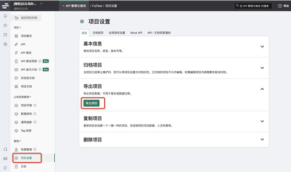 Eolinker 数据导出方法:打开 Eolinker 里对应项目,点击左侧菜单项目设置,在项目 Tab 里点击导出项目,选择Eolinker 项目数据 (.json),然后导出,如下图所示: