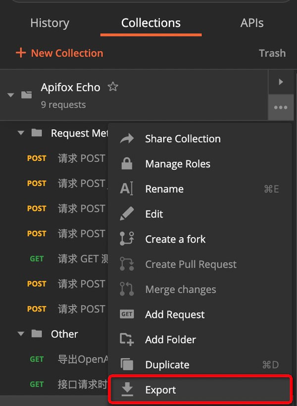 数据导出方法:找到 Postman 左侧列表 Collections,鼠标移到需要导出的集合,点击···,选择Export然后选择Collection v2.1 (recommended)即可导出,如下图所示:
