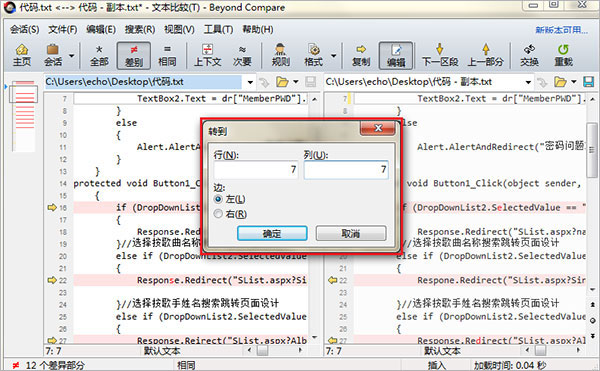 通常在比较代码文件时,代码文本内容十分的繁杂和冗长,如果想要快速查找某一行的文本内容该怎么办呢?其实一个简单的快捷键操作就可以解决这个问题。使用Ctrl+G快捷键后将会弹出一个“转到“的窗口页面,输入您需要转到的行号信息,并选择查找位置,光标将会即刻跳转到相应位置。