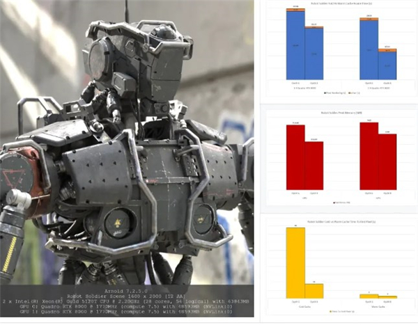 更好的多 GPU 缩放:在具有多个 AOV 的场景中,使用多个 GPU 的渲染时间缩放已得到改进。添加第二个 GPU 后,具有 9 个 AOV 的机器人士兵场景从之前版本的 Arnold 中仅有 1.1 倍的加速到 Arnold 7.2.5 中的 1.7 倍加速。
