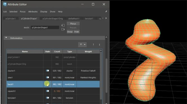 角色绑定师能够在属性编辑器中获得一个新的变形控件,可以查看并管理作用于对象的变形器和拓扑修改器,而无需使用节点编辑器。