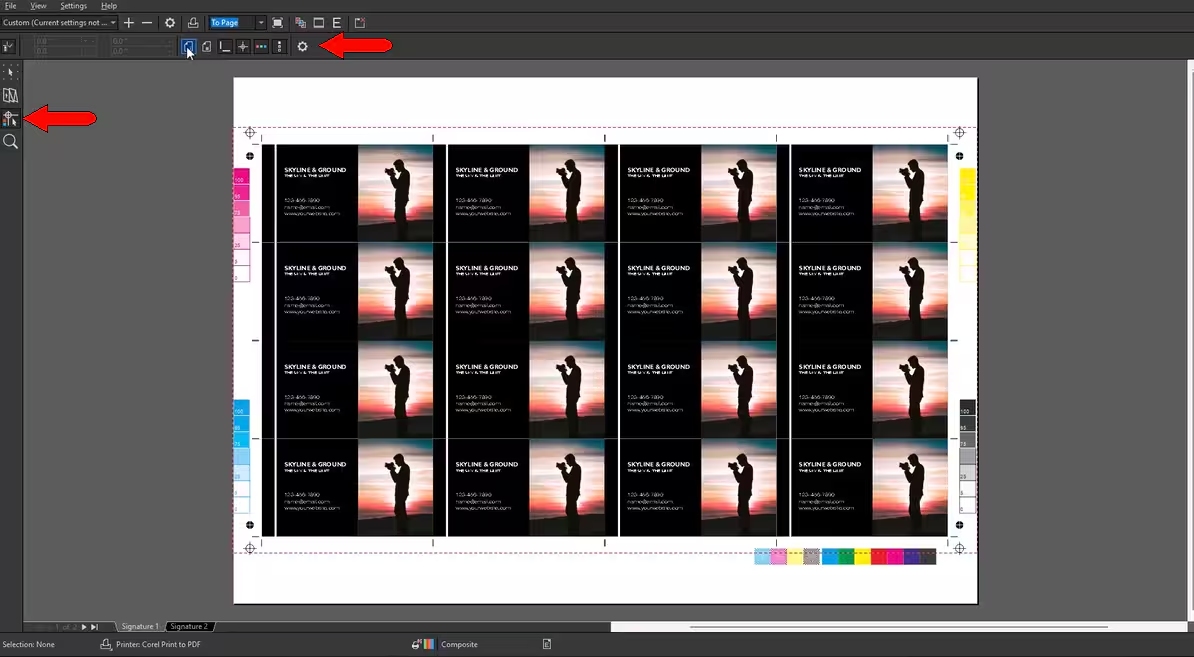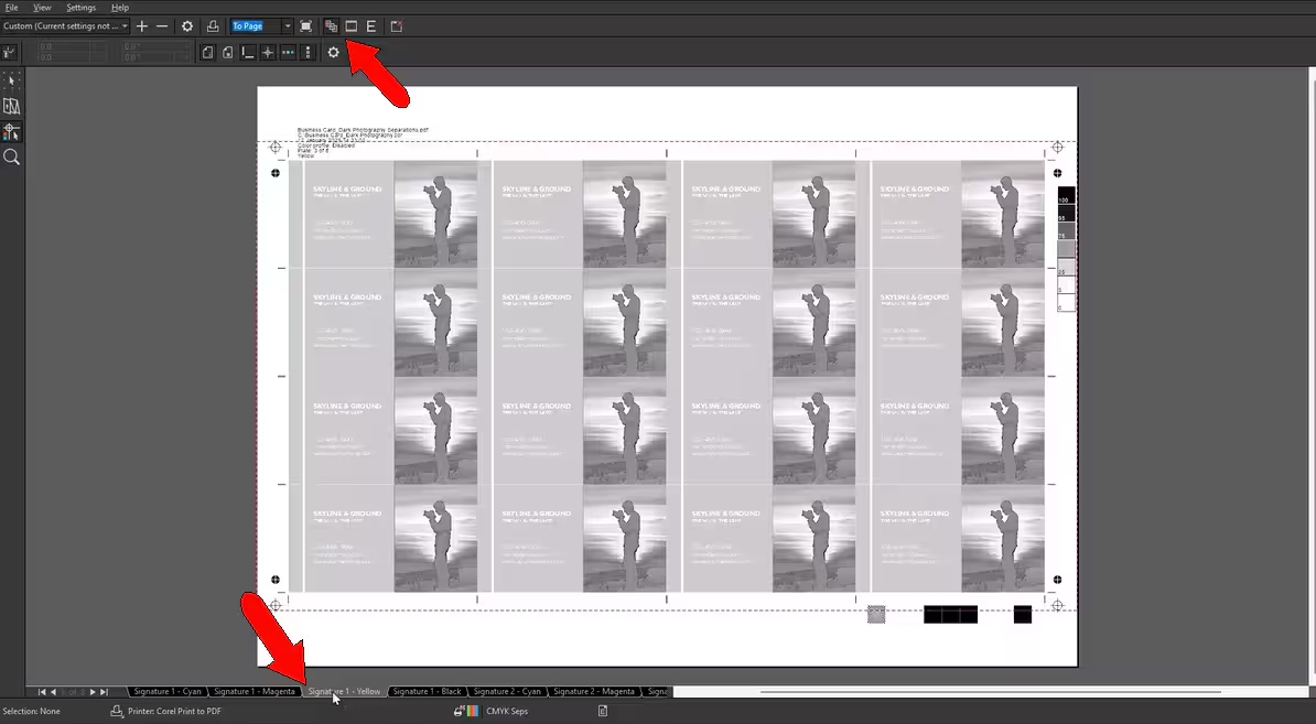 生成的 PDF 包含每个印版的单独页面,其中包含两面的 CMYK 打印数据以及所有标记和文件信息。