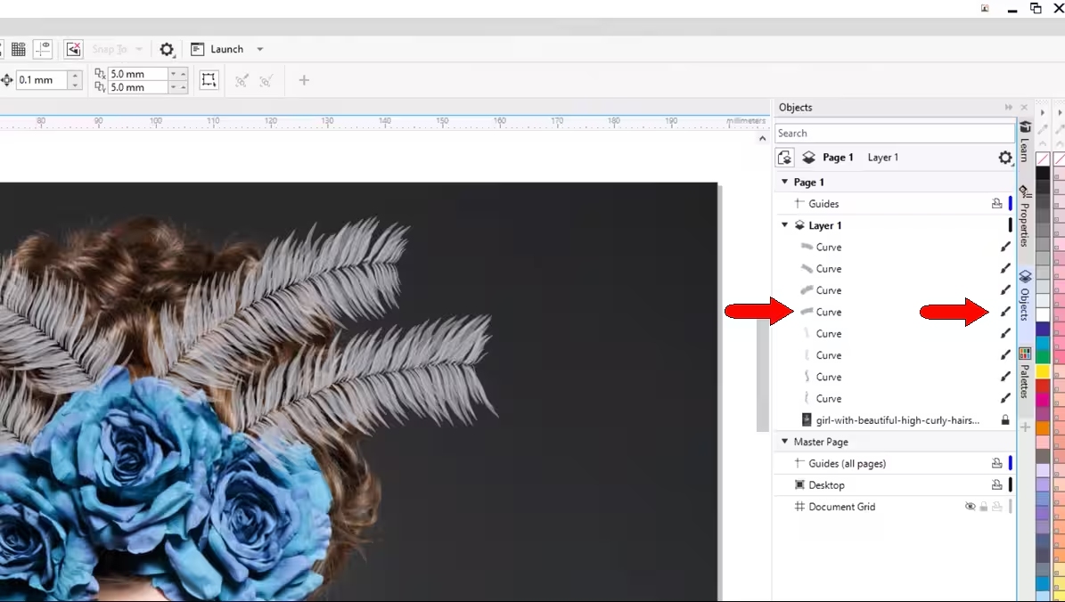 在对象泊坞窗中,从头开始的笔触称为曲线,带有附加画笔图标,表示已应用位图效果。