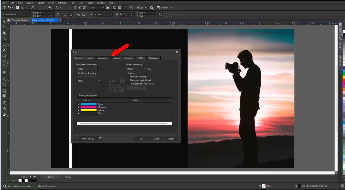 “颜色”选项卡包含“分色”选项,可打开“分色”选项卡。这对于经济高效的胶印至关重要,因为胶印需要为每种颜色单独印版。