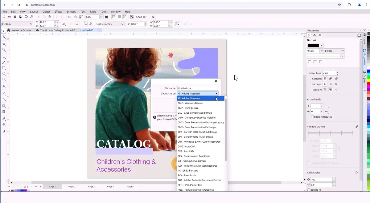 CorelDRAW Web 支持多种文件格式,包括 CDR、PDF、AI、SVG 等。
