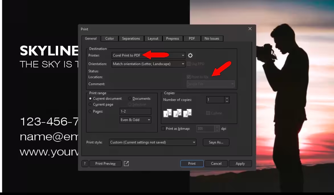 要打印为 PDF,请选择“文件/打印”,然后选择“Corel 打印为 PDF”。“打印为文件”选项将自动选中。