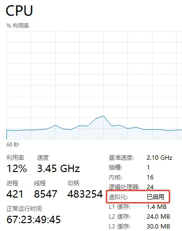 ① 虚拟化。任务栏上右键【任务管理器 - 性能 - cpu】里面看看虚拟化是否“已启用”状态。可能因为一些操作被关闭,如果未启用需要查找教程打开。