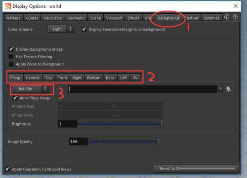 4、对于导入参考图的方法,这里提供了两种不同的方式:Disk File和COP Image。要注意的是,如果想在其他视图中显示参考图,则要在对应的视图选项卡里设置和导入参考图,这样设置的是Persp透视图。