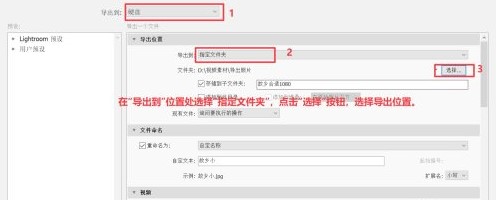 2、在“导出到”位置处选择“指定文件夹”,点击“选择”按钮,选择导出位置。