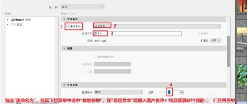 5、勾选“重命名为”,在其下拉菜单中选中“自定名称”,在“自定文本”处输入图片名称,将品质滑块拉到最大,则品质最好。
