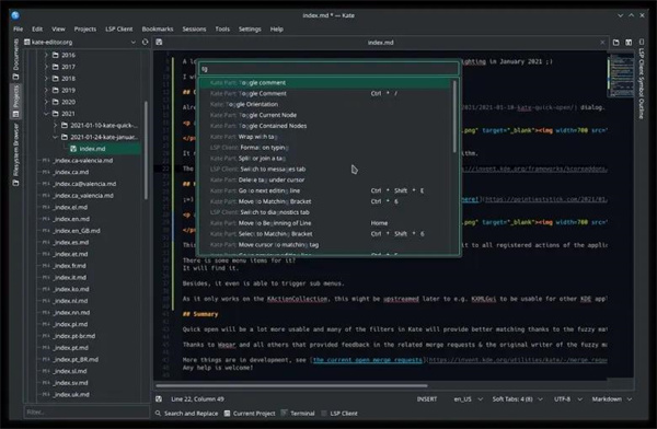 VSCode工作流程的关键组成部分之一是“命令面板”,这可能是VS Code中最常用的功能之一。经过漫长的等待,Kate终于实现了这一功能。