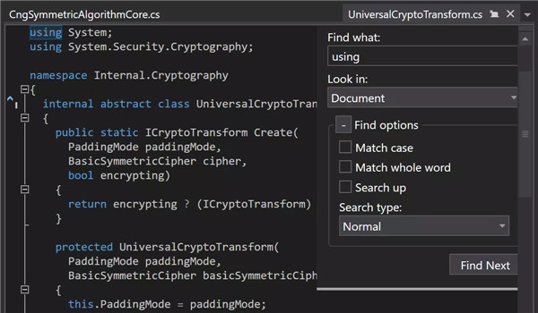 我们将 Quick Find(快速查找)功能从单独的工具窗口移至文本编辑器标签页。 现在,为文件调用 Quick Find(快速查找)(Ctrl+F) 时,Quick Find(快速查找)窗格将出现在该文件的文本编辑器标签页内。