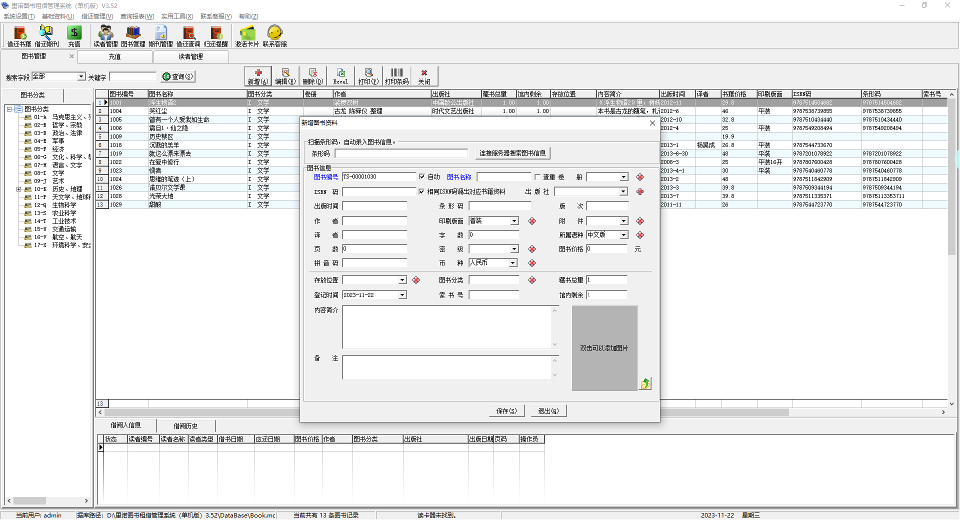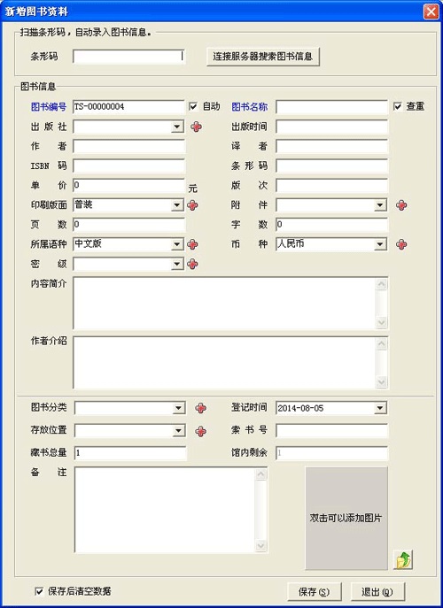 新增图书资料窗体,把光标定在条形码上,用扫描枪扫一下图书的ISBN码,然后该图书的信息就能自动出来。