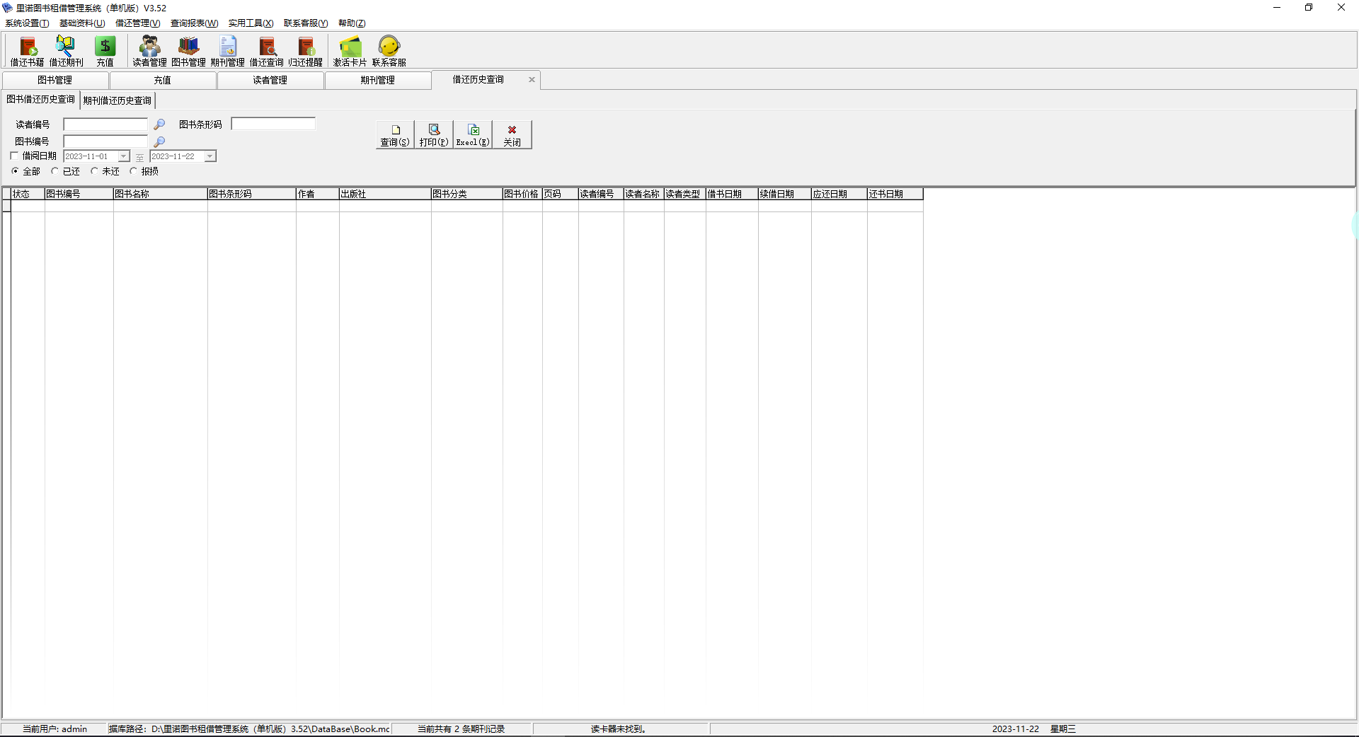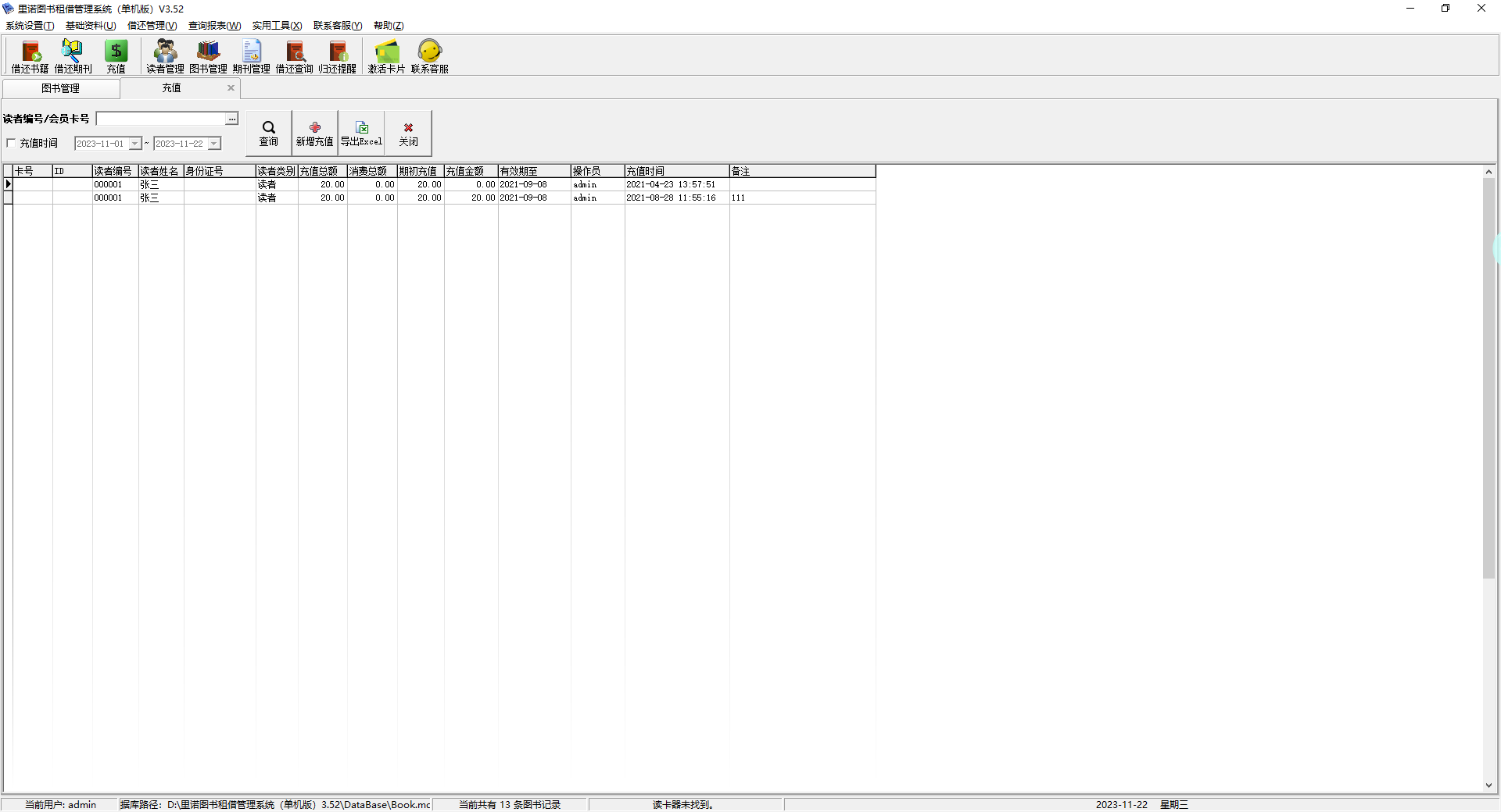 1、打开里诺图书管理系统官方版,进入软件主界面,可看到包括【借还书籍】、【借还期刊】、【充值】、【读者管理】、【图书管理】、【期刊管理】、【借还查询】、【归还提醒】、【激活卡片】和【联系客服】功能选项,