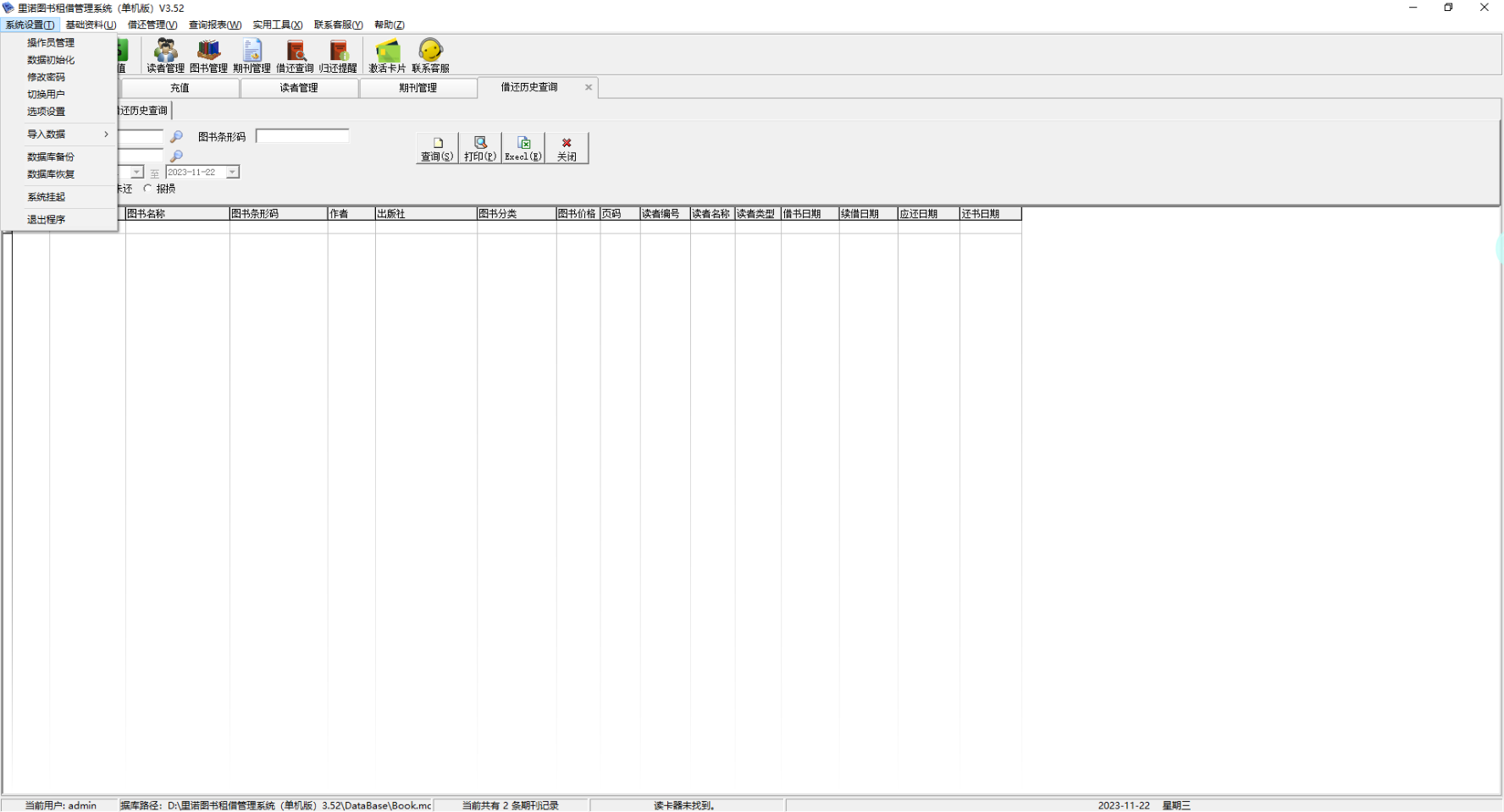 7、我们还可以通过左上角的【系统设置】进行操作员管理、修改密码、切换用户、选项设置、导入数据、数据库备份等相关的设置,以上就是里诺图书管理系统官方版使用教程了。