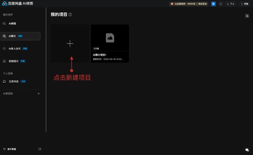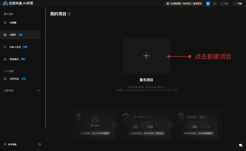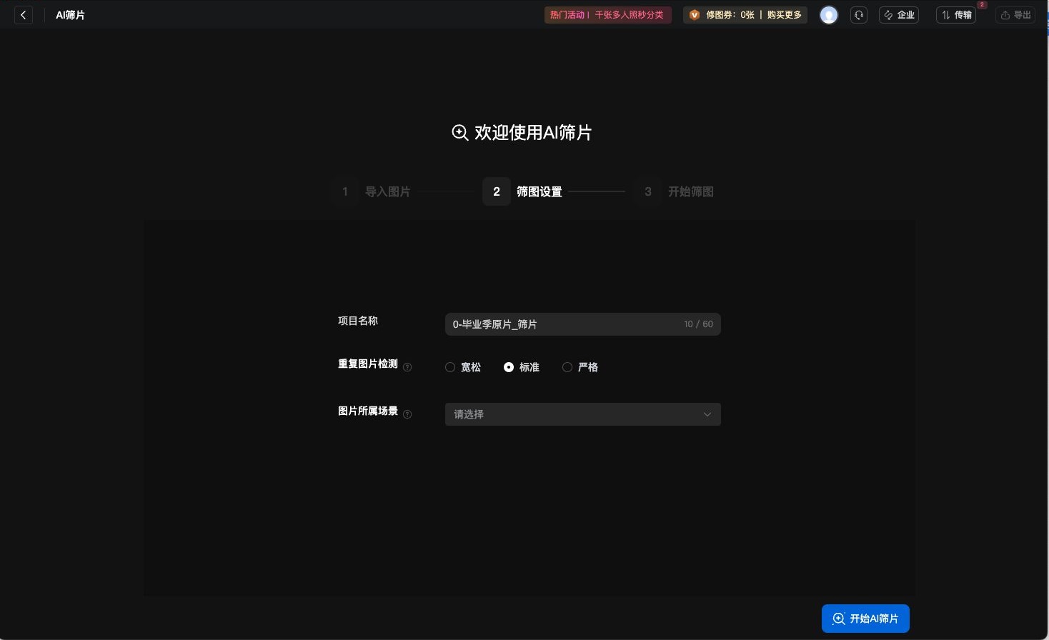 在左侧功能导航栏,切换到“AI筛片”功能上。有2种方式可以新建一个AI筛片项目:
