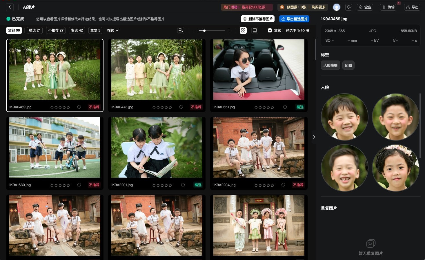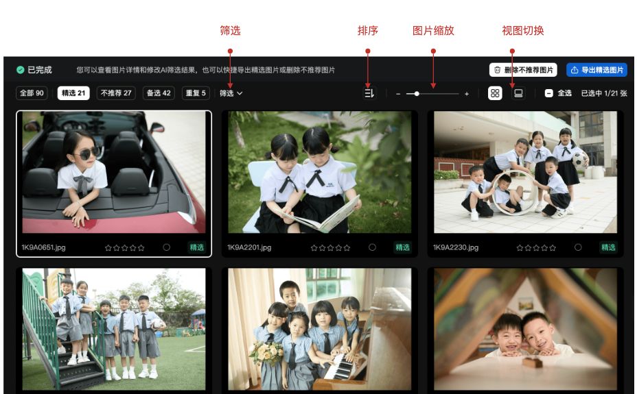 AI筛选时,会从一组重复图片中挑出最多一张精选图片作为封面图。如果该组图片都不符合美学标准,则该组精选图片数量为0。