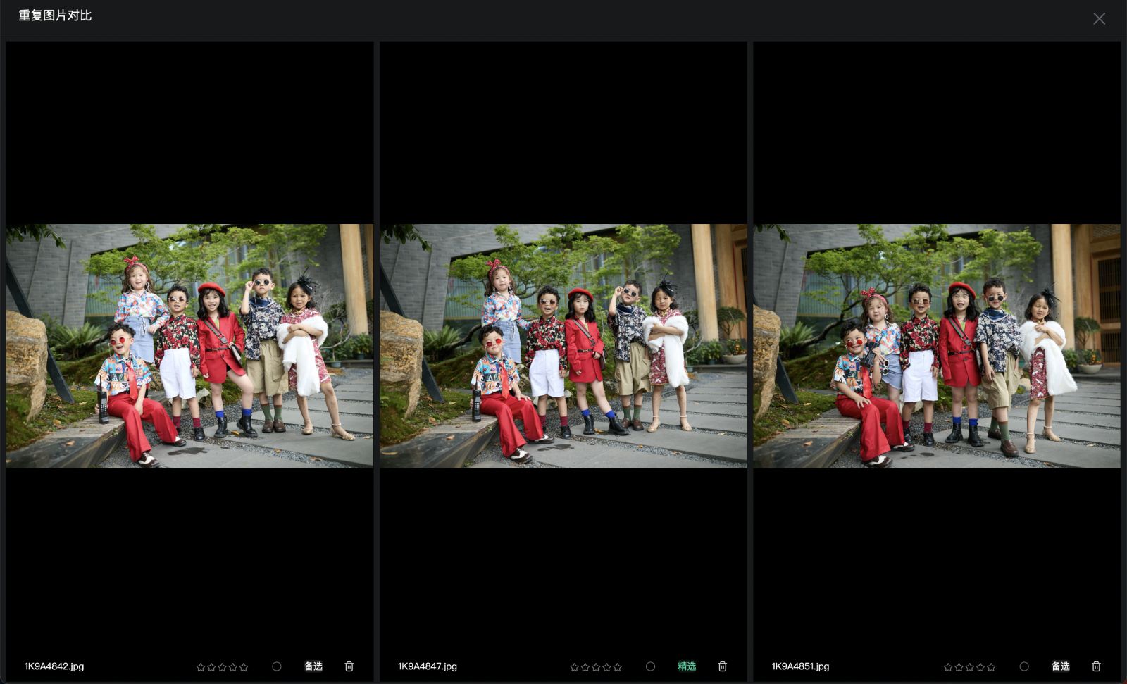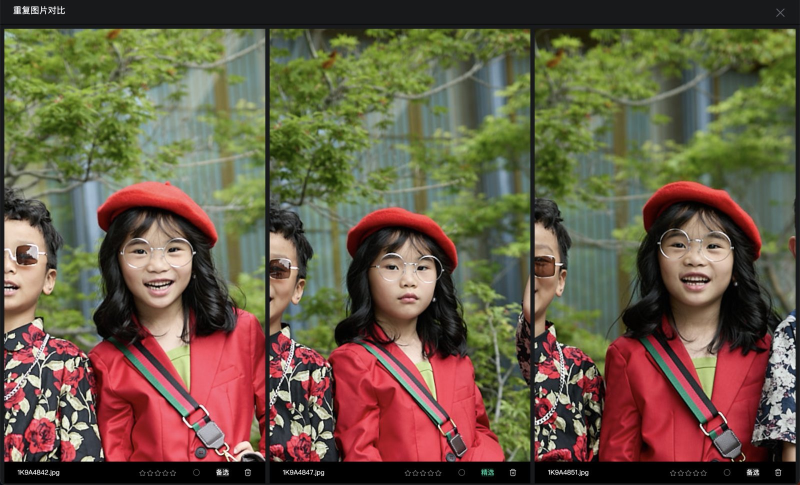 严格:场景和人物完全相同、人物动作几乎一样的照片,才会被识别为重复图片;