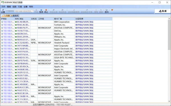 扫描的结果包括IP地址、MAC地址、主机名和网卡厂商。如果扫描结果中存在一个MAC地址对应多个IP地址的情况,物理地址扫描器会自动识别并按照其对应关系正确显示